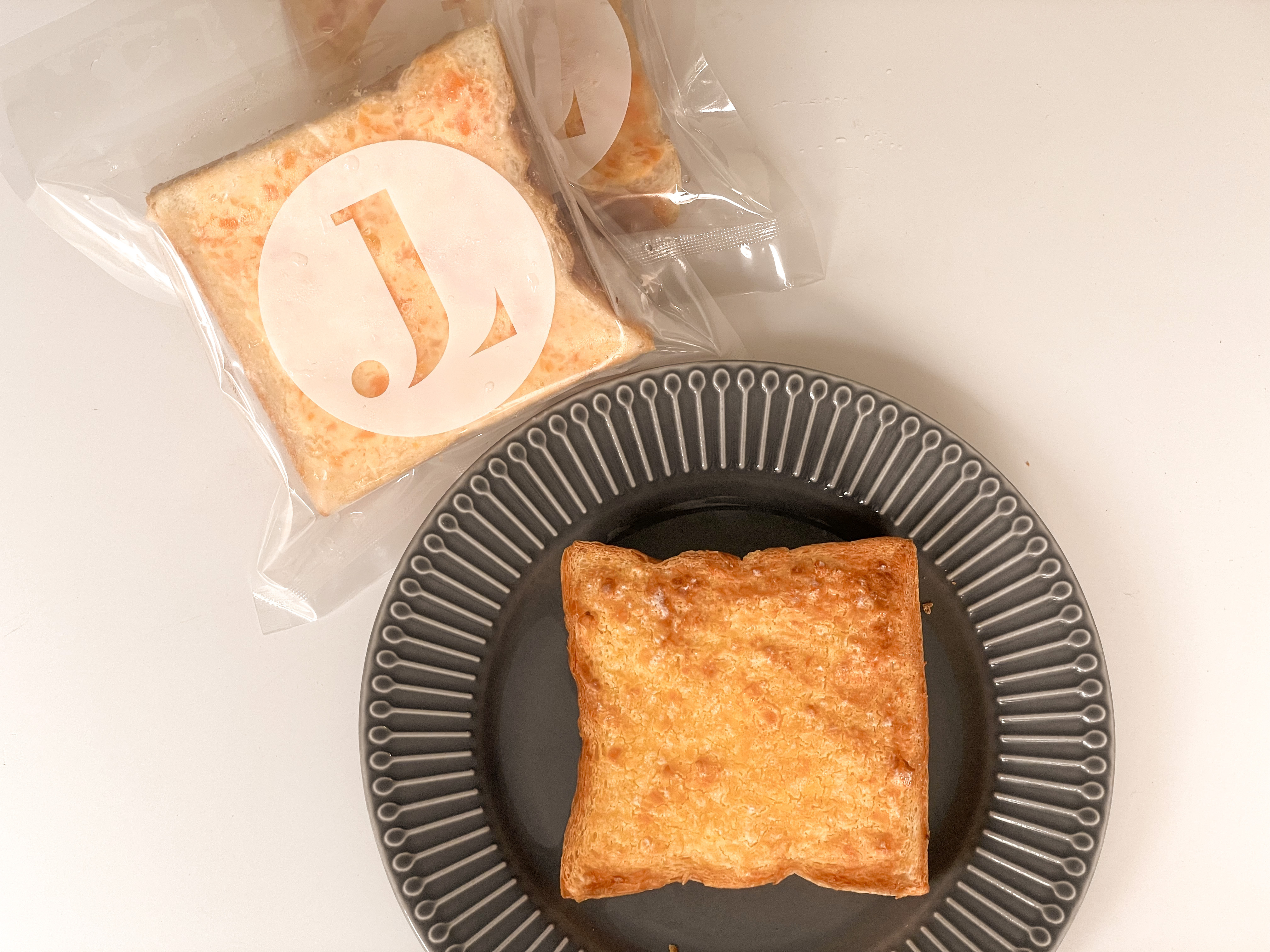 J.L.獨家特調的兩款金莎抹醬一鹹一甜,從還沒接觸麵包這領域,我們就會做這個抹醬來吃,現在終於找到命定的吐司去襯托它,回烤過後外皮酥脆裡面柔軟Q彈,金莎香味濃郁,奶香充足。